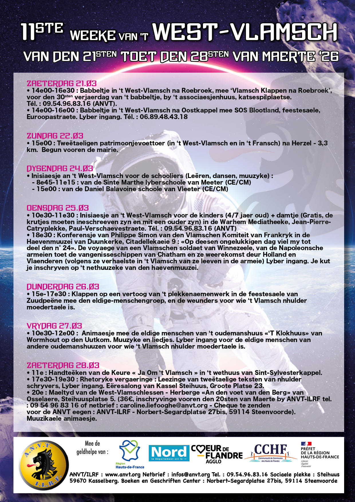 Van Roebrouck naer Oostkappel, van Herzel naer Meeter, en deur Vleeter, Warhem, Zuudpeëne, Wormhout, Sint-Sylvesterkappel, Kassel en Osselaere, doet maer mei mee de aktiviteiten dan me gereëd edaen hen : tweëtaeligen voettoer, inisiaesjen an de Vlamsche taele, babbeltjes, animaesje mee de eldige menschen, konferensje en rhetorykeaevend, ezv : een program van gratis aktiviteiten om nuuze schoone Vlamsche streeketaele te ontdekken en te geeren !
