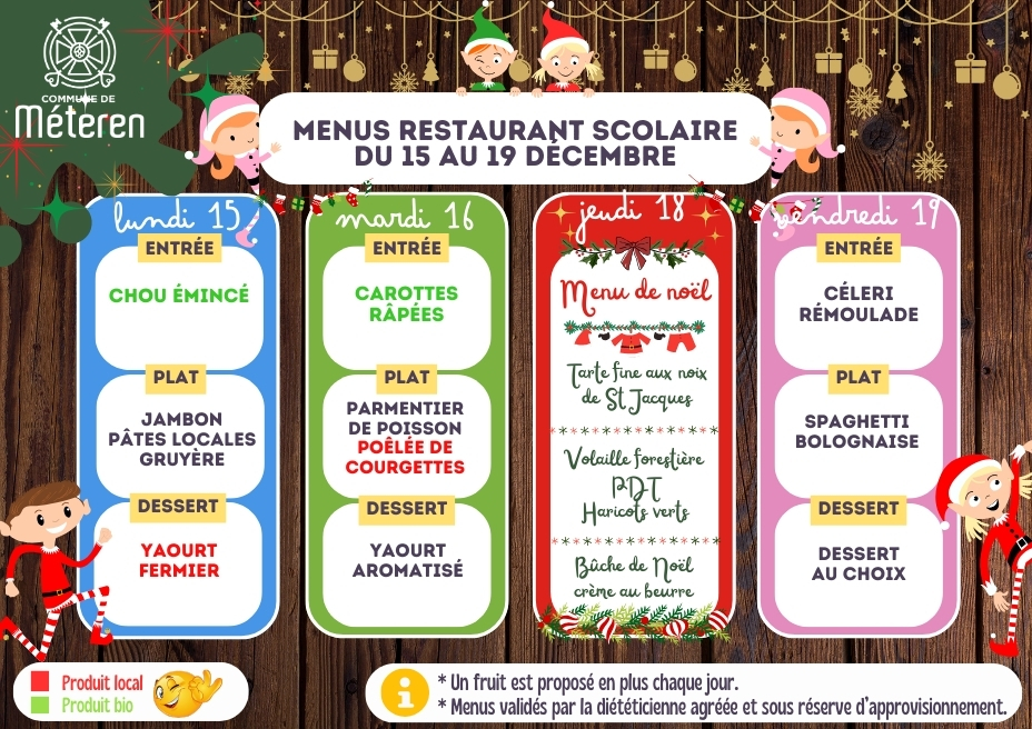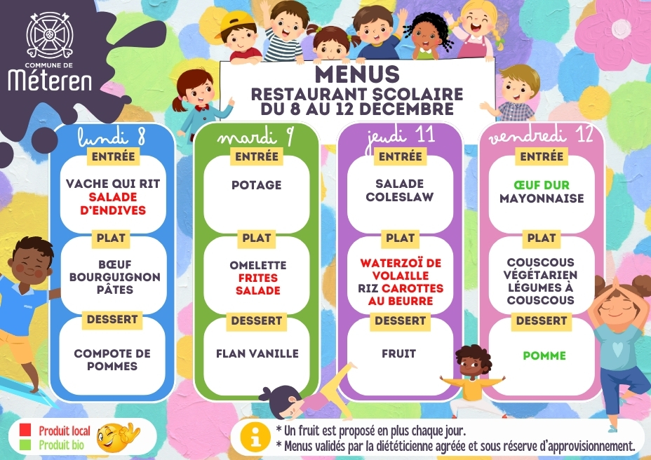 Vous trouverez dans les menus : en vert les produits issus de l'agriculture biologique et en rouge les produits locaux